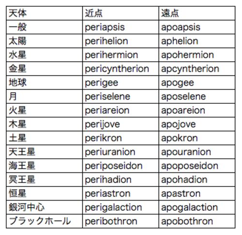 天体の楕円軌道の近点/遠点を表記する用語は、どの天体を周回するかによってバリエーション豊富なため、整理してみます。 たとえば太陽を周回する軌道なら、近日点/遠日点となり、地球を周回する軌道なら近地点/遠地点となります。他の惑星も近*点/遠*点の…